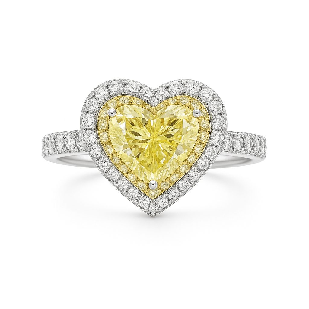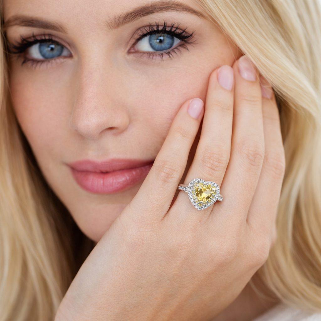 Pedra Central: Zircônia Yellow premium com lapidação em formato de Coração, oferecendo facetas que maximizam a refração da luz.