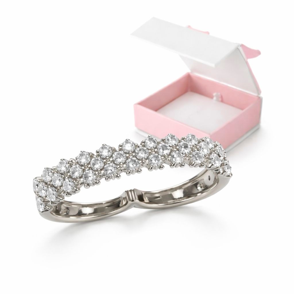 Complemente seu look com o Anel Duplo Dois Dedos Zircônias Cravejadas Joias , uma peça delicada que complementa qualquer visual com elegância e modernidade.