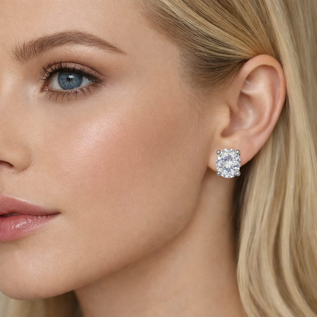O Brinco Oval Moissanite é a escolha definitiva para quem busca o brilho máximo da alta joalheria. Com uma gema central de 4.13 quilates, esta peça supera o diamante em índice de refração, garantindo um fogo e uma luminosidade inigualáveis. O corte oval de 9x7mm oferece um design alongado que confere sofisticação imediata ao rosto, sendo uma joia clássica e imponente.