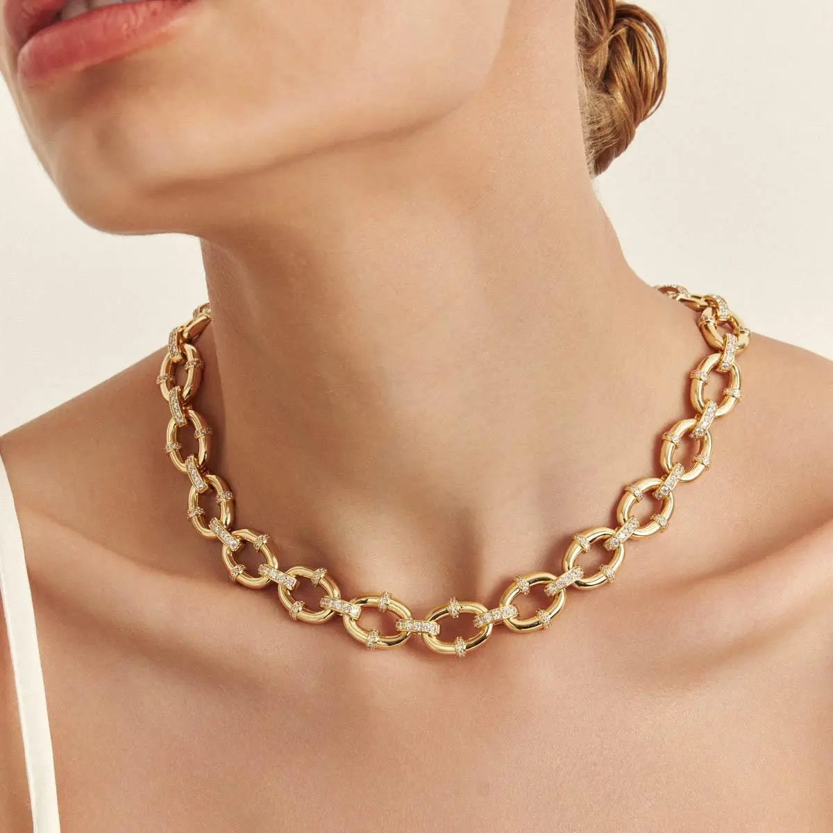 Destaque Único: Use-o como peça principal sobre camisas de gola aberta ou vestidos de decote em “V” para valorizar a largura e o brilho dos elos.