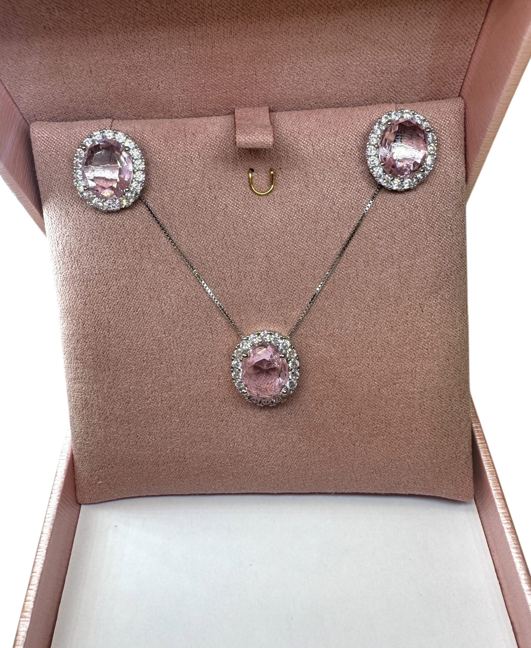 Conjunto Oval Rosa Prata 925 é Aquele Conjunto Coringa para usar todos os dias e não tirar mais, joia na prata 925, com um Brilho Exuberante sua lapidação assemelha a um diamante.
