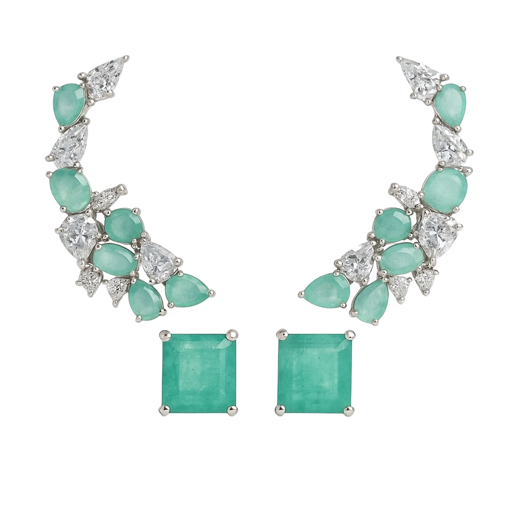 Brinco Ear Cuff Luxuoso Esmeralda Colombiana Fusion Prata 925